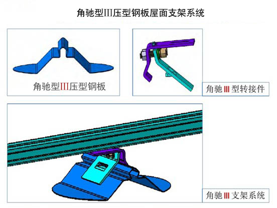 以上三种屋面支架系统,适合于厂房或仓库等大面积的彩钢瓦屋顶,采用铝制或不锈钢夹块将系统固定在屋面上。先进的设计,使整个系统的零件种类减到最少,安装简单快速。可用于安装任意规格太阳能多晶硅组件及薄膜组件。